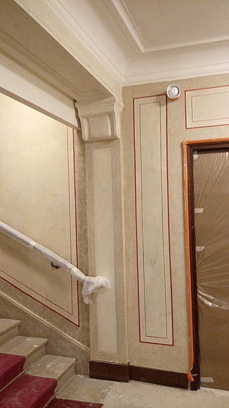 Dégagements et restauration de décors faux marbre et trompe l’œil, fausse-pierre, filage, peinture dorée, pose de vernis au chantier de restauration du Théâtre du Châtelet avec l’atelier de restauration de décors Eschlimann.