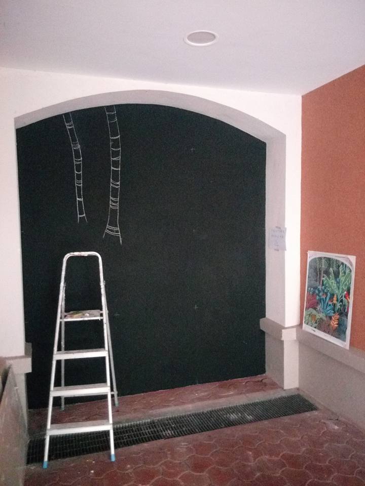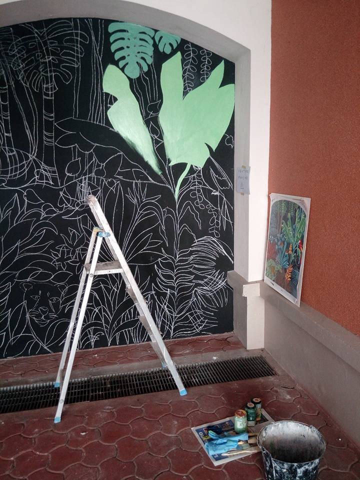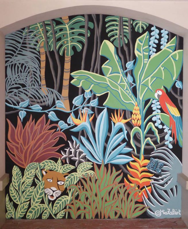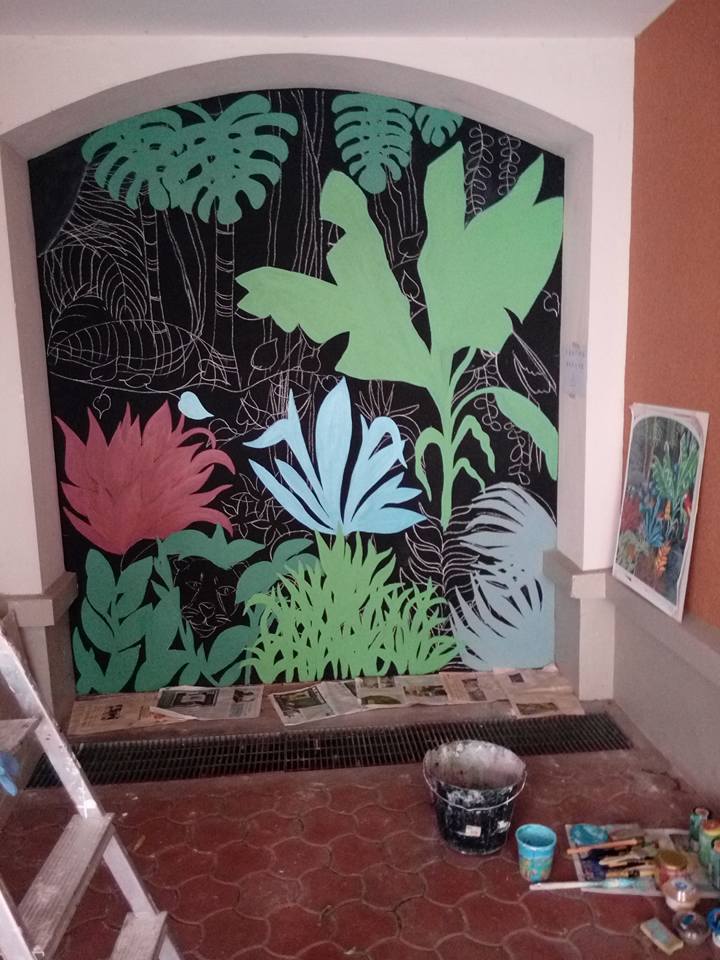 Réalisation d’une fresque murale d’inspiration jungle en extérieur sur 7m2 :